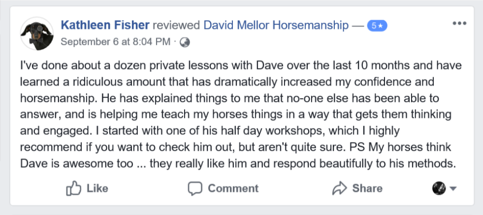 David has developed a method of marrying the two worlds of Natural Horsemanship with the traditional concepts of dressage. He believes this gives students the best of both worlds regardless of age or ability.