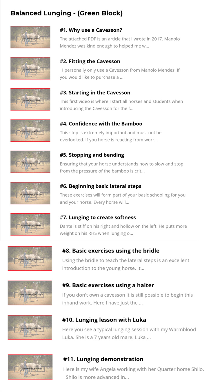 This video set contains 11 new videos introducing you to Lunging with a Cavesson. It is designed to follow on from 'Building a connection from the ground.' (Blue Module)